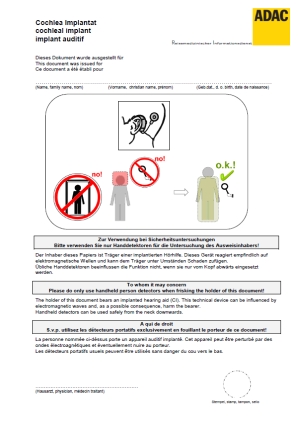 Weil es nicht immer leicht ist, dem Sicherheitspersonal zu erklären, worauf genau zu achten ist, unterstützt Sie der ADAC mit dem untenstehenden Formular, das Sie sich hier herunterladen können. Mit Unterschrift und Stempel eines Arztes (Ihres Hausarztes, HNO-Arztes oder Ihrer Implantationsklinik) versehen, hilft es Ihnen, problemlos in den Urlaub starten zu können und währenddessen nicht auf eine tadellos funktionierende Hörhilfe verzichten zu müssen.